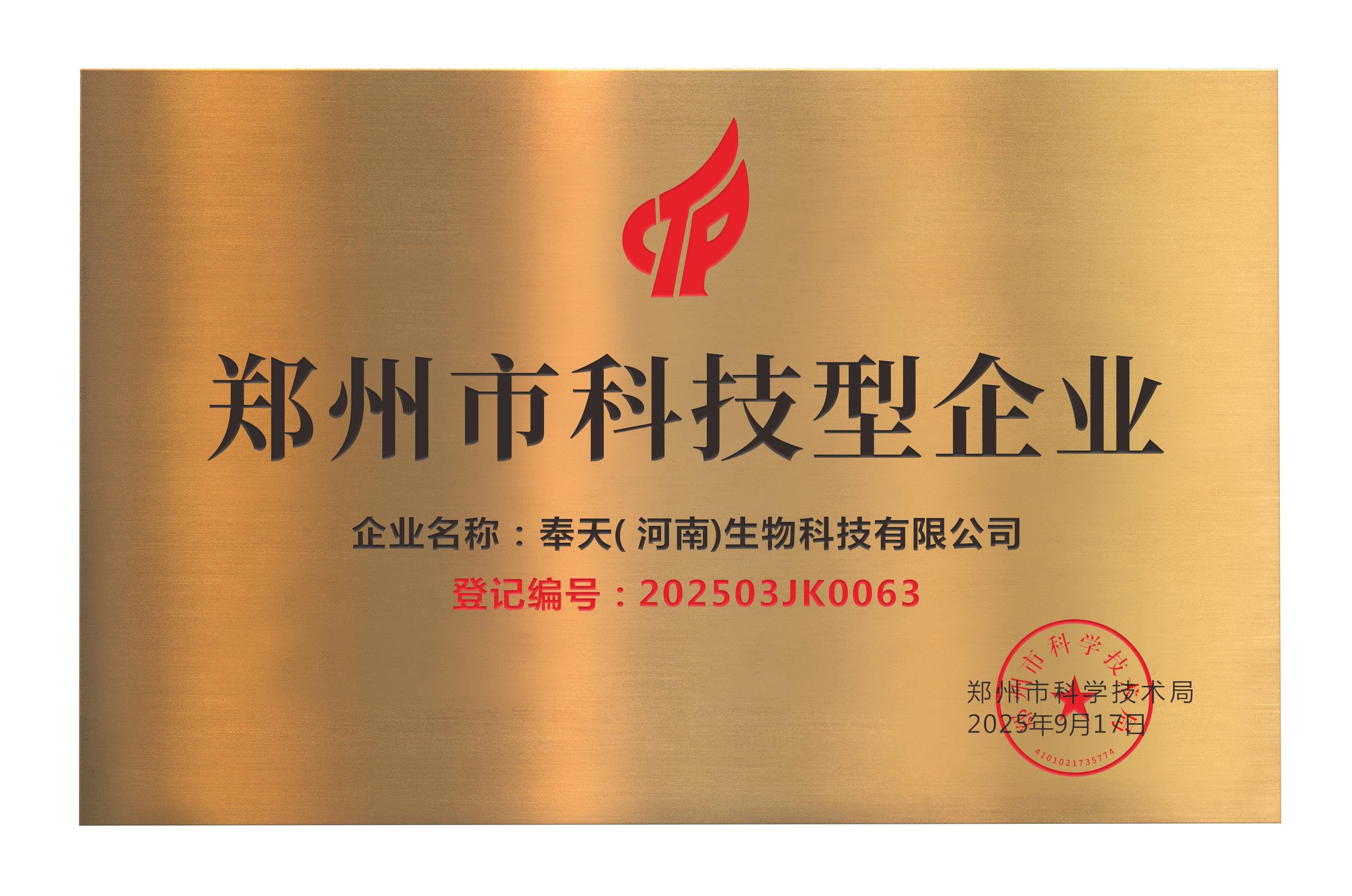 热烈祝贺奉天(河南)生物科技有限公司荣获“2025年度郑州市科技型企业”