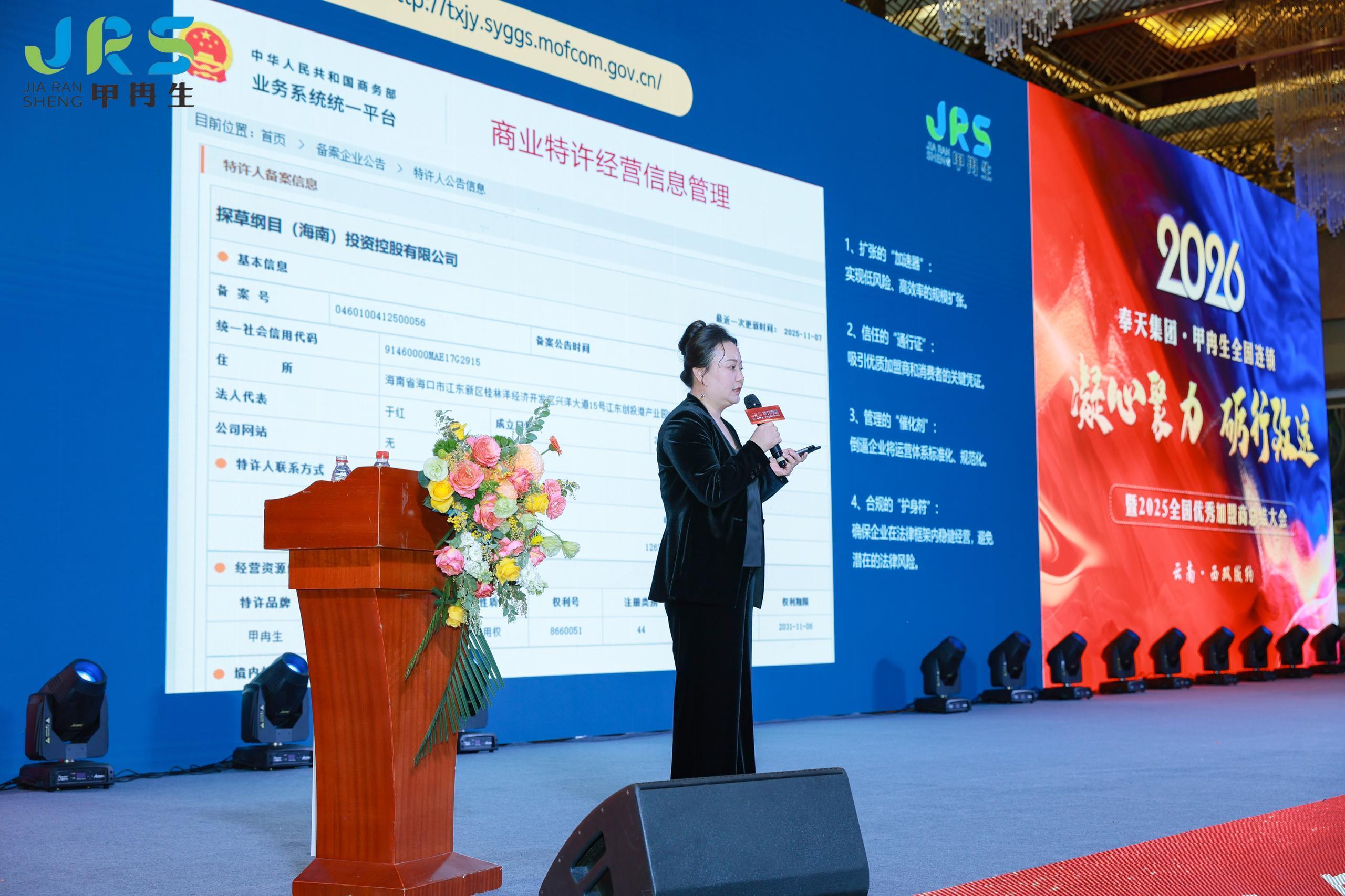 奉天集团董事长、甲冉生品牌创始人于红,给大家讲解甲冉生全国连锁的发展规划:一是规范甲冉生品牌连锁的运营,升级统一的门店形象和修护服务标准。二是甲冉生在商务部的商业特许经营备案已经登记(官网http://txjy.syggs.mofcm.gov.cn),如果门店需要公司也可帮助登记。三是办公生产基地进行扩建,高标准生产新产品。四是市场开发,以科学的管理模式,发展壮大连锁门店,力争实现未来三年达到万家门店。五是加大新媒体运营,为品牌和门店赋能。做好以上工作,努力把甲冉生打造成行业领先、顾客信赖的知名品牌,于总的讲解赢得了全场人员热烈掌声。