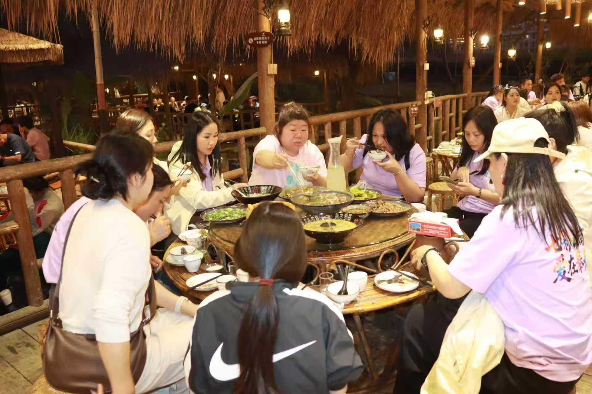 晚上6时许,大家享用了佤王宴,欣赏过晚宴上的歌舞表演之后,结束了一天的西双版纳精彩之旅,旅游团乘车返回酒店。