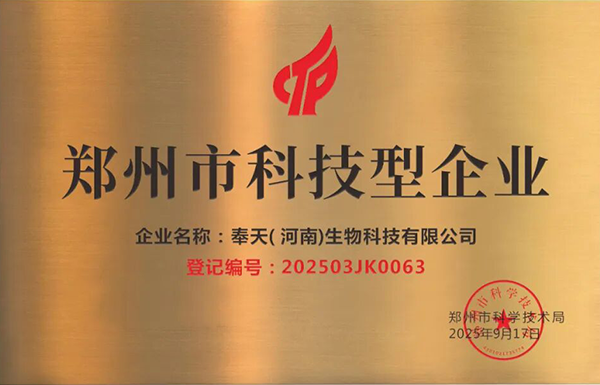 2025年9月,奉天集团旗下企业--奉天(河南)生物科技有限公司荣获“2025年度郑州市科技型企业”。