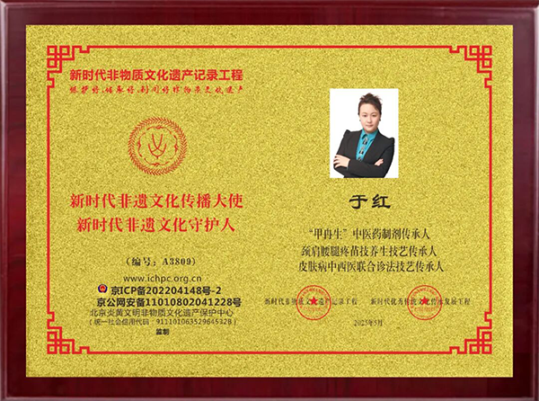 2025年5月,奉天集团董事长、甲冉生品牌创始人于红,荣获新时代非物质文化遗产记录工程、新时代优秀传统文化传承发展工程:新时代非遗文化传播大使、新时代非遗文化守护人、“甲冉生”中医药制剂传承人、颈肩腰腿疼苗技养生技艺传承人、皮肤病中西医联合诊法技艺传承人。