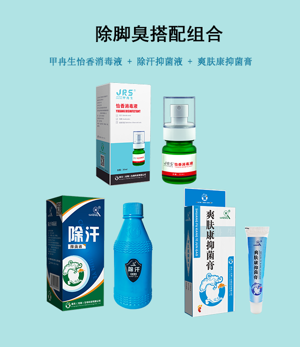 调理脚汗、抑真菌,去脚臭,可使用甲冉生产品组合:甲冉生怡香消毒液+除汗抑菌液+爽肤康抑菌膏。