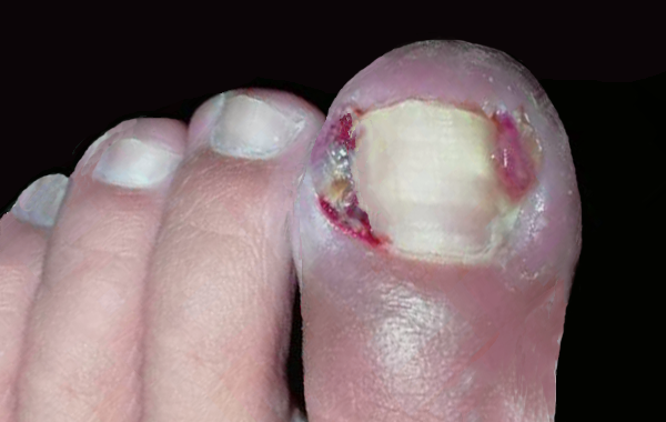 嵌甲,简单的来理解,就是甲板偏短,有的伴有甲板两边过于弯曲内卷,从而导致甲沟破损而形成,多数都是发生在大脚趾上。