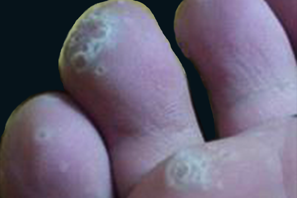 判断跖疣,依据表现有:细小发亮丘疹,绿豆大小,渐增大至黄豆大小或更大,表面粗糙,呈肉刺状,灰黄或污灰色,境界清楚,绕以增厚的角质环,若将表面角质层去除,可见毛细血管破裂外渗凝固而形成的小黑点。有时多个跖疣聚集在一起,形成多个角质软芯,称为镶嵌疣。