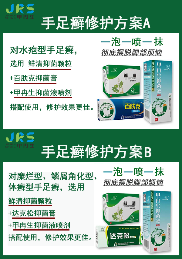 快速、有效的护理祛除脚气,甲冉生手足修护连锁研制开发的强效抑菌产品:鲜清抑菌颗粒、甲冉生抑菌液、百肤克抑菌膏、达克松抑菌膏,均萃取植物药材温和不刺激的精华成分精制而成,开创独特的“泡-喷-抹”整体方案,按照脚气类型搭配产品使用,功效独到。