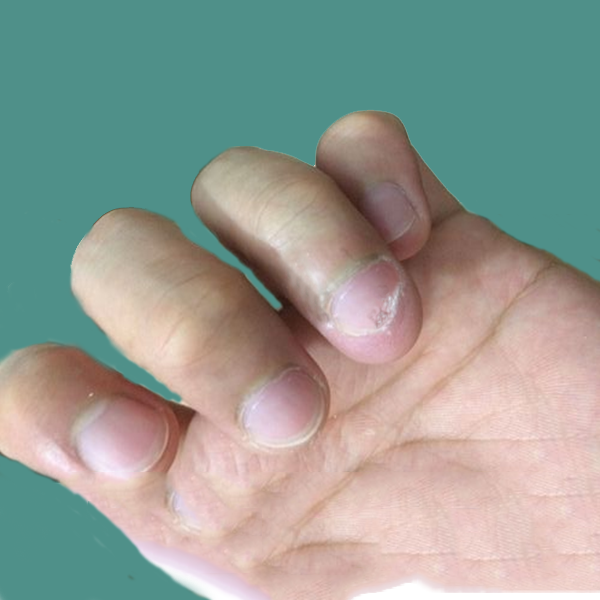 3、先是1--2个指甲,甲板失去光泽。正常的指甲红润透明。